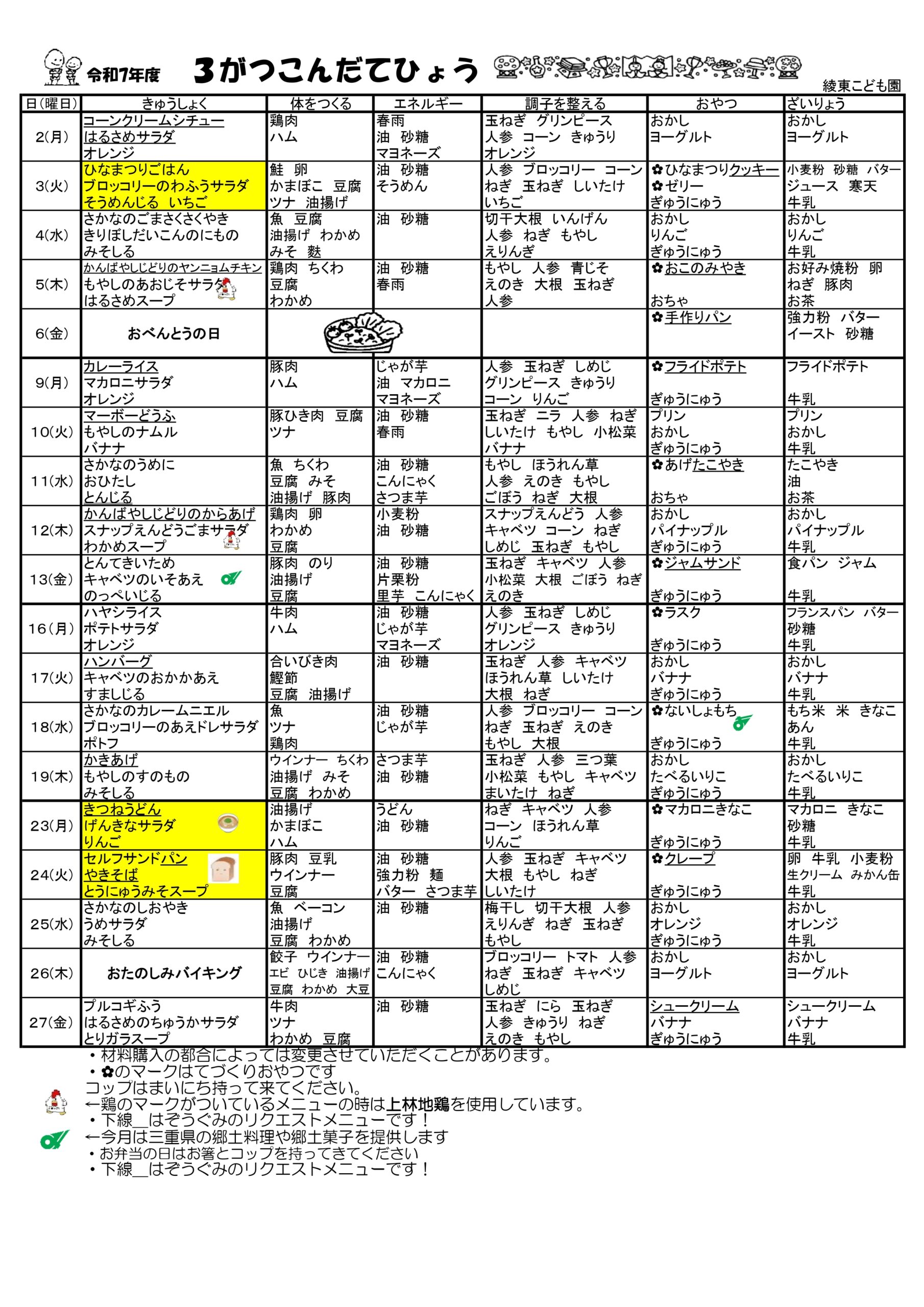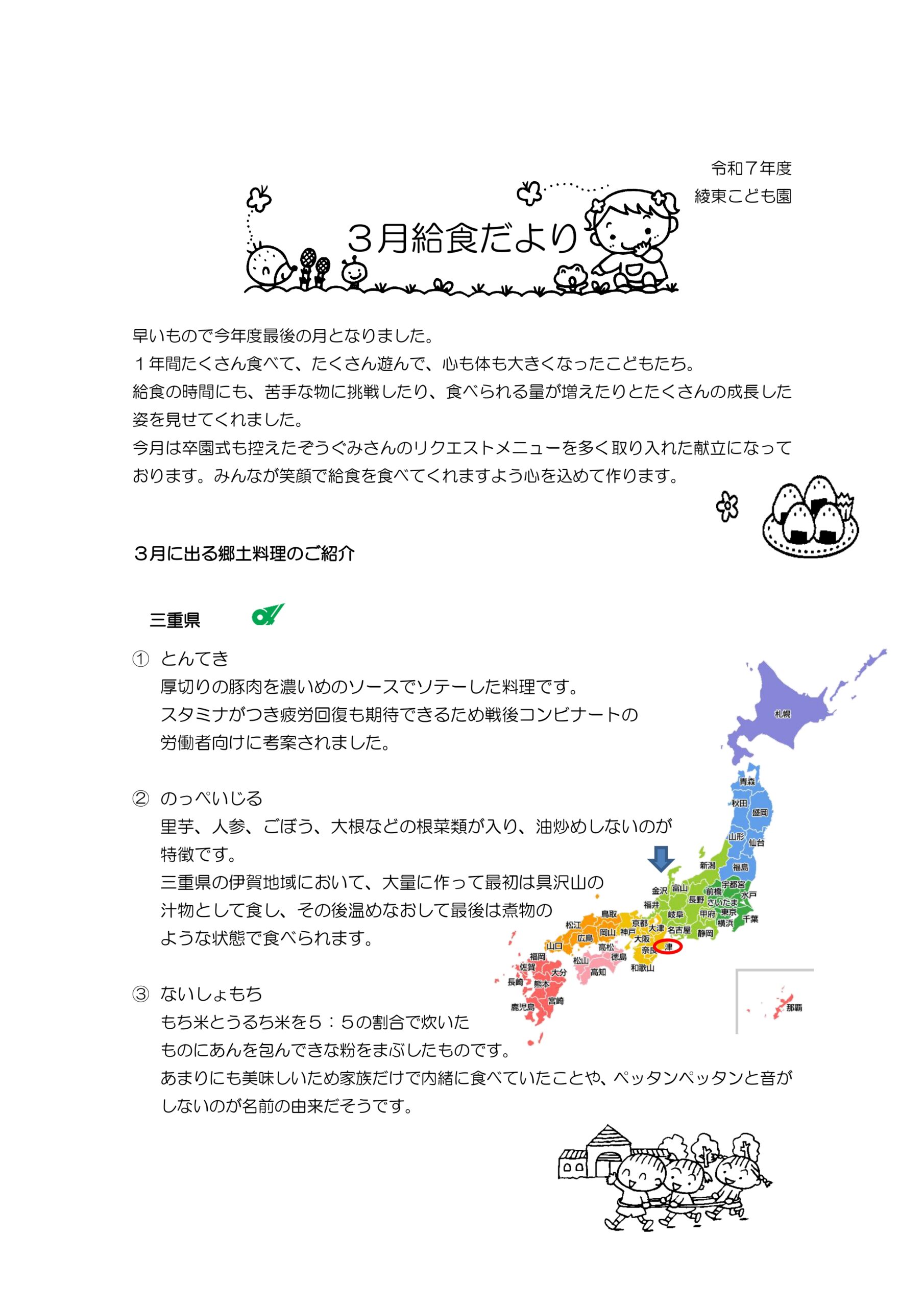 2026.02.27 綾東こども園ニュース 給食だよりR7年度(3月号)追加いたしました。(令和8年3月) 令和7年度献立表&給食だより(3月号)追加いたしました。(令和8年3月) クリックするとPDFで表示されます。