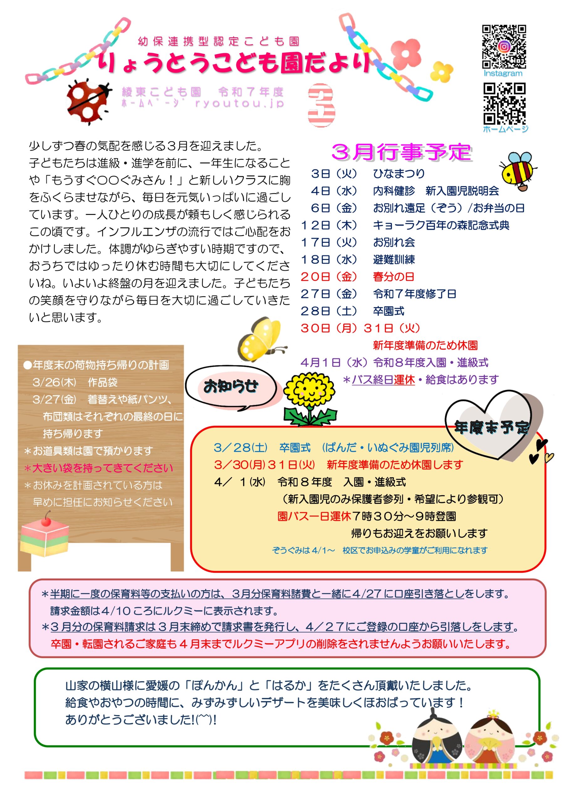 2026.02.27 綾東こども園ニュース 綾東だよりR7年度(3月号)追加いたしました。(令和8年3月) 令和7年度綾東だより(3月号)追加いたしました。(令和8年3月) クリックするとPDFで表示またはダウンロードされます。